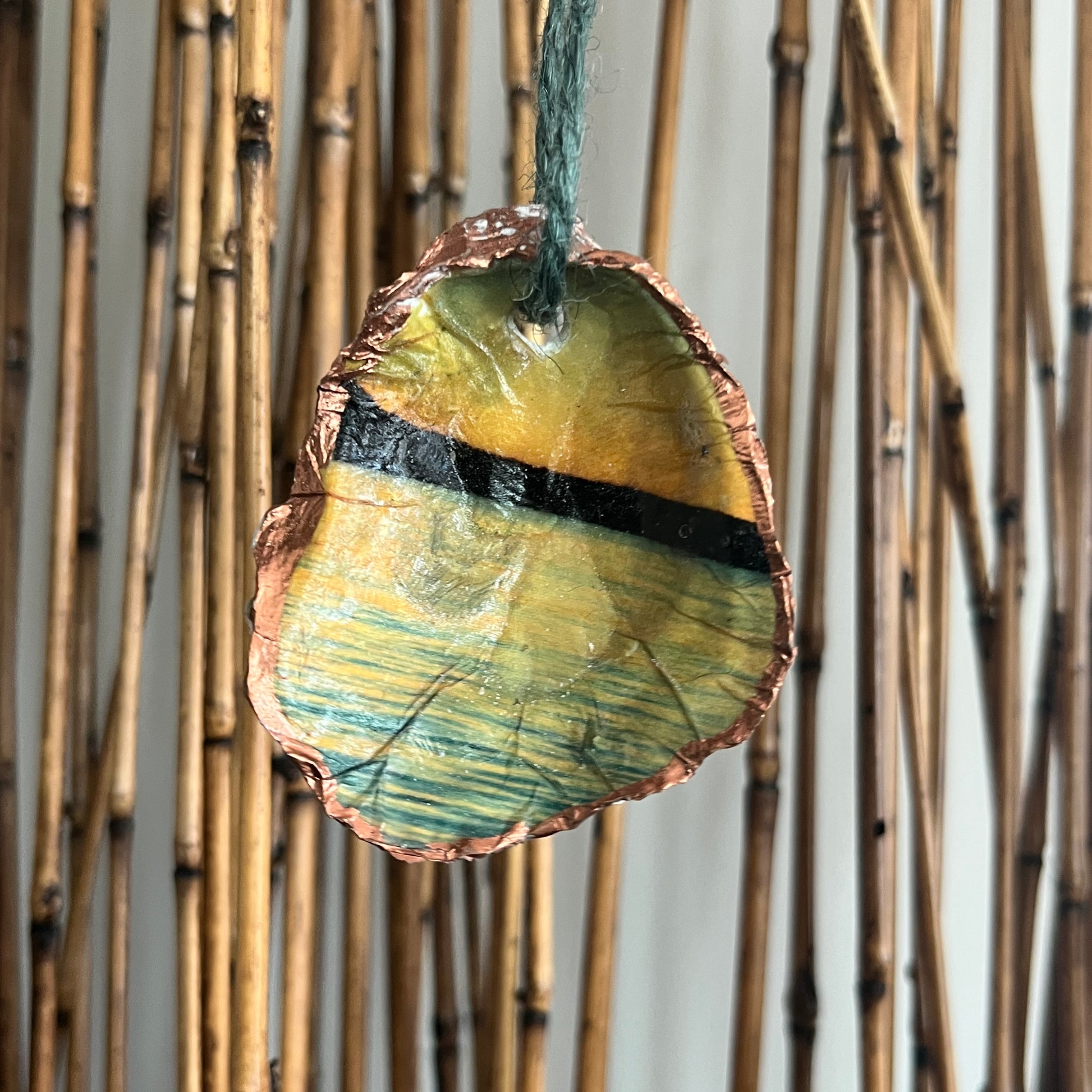 Each ornament is handcrafted using a locally sourced oyster shell, selected for its natural shape and texture. The artwork is carefully applied and sealed beneath a glossy protective finish, while the copper-toned edge highlights the organic form of the shell.